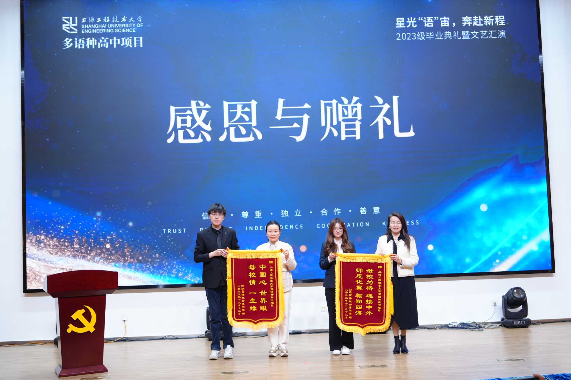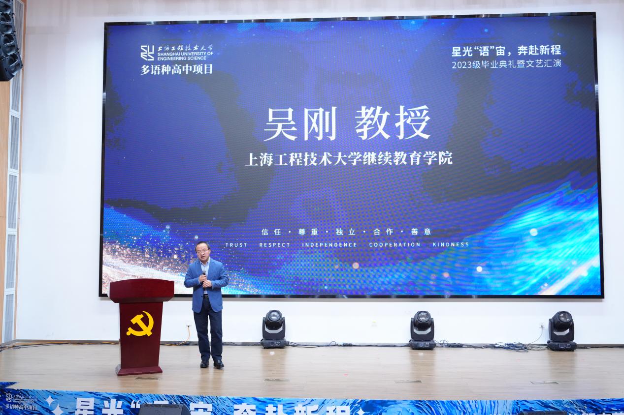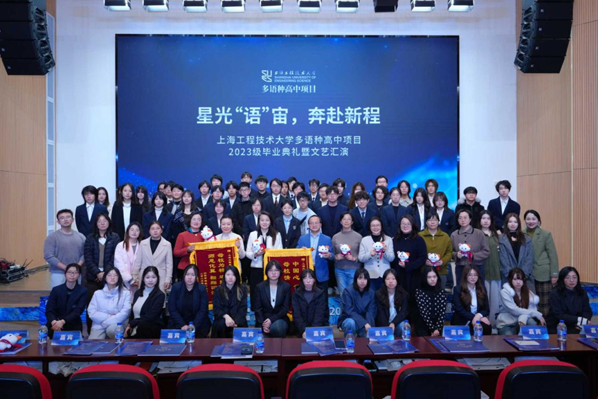 2025年12月18日下午,3003新葡的京集团网址多语种高中项目2023级毕业典礼暨文艺汇演在3003新葡的京集团网址长宁校区产教融合大楼报告厅隆重举行。本次活动以“星光‘语’宙,奔赴新程”为主题。继教产业联合党总支书记袁蓉教授、3003新葡的京集团网址副院长(主持工作)吴刚教授及相关职能部门负责人、多语种高中项目全体师生与毕业生家长代表齐聚一堂,共同见证2023级学子完成高中学业,开启海外深造新征程。