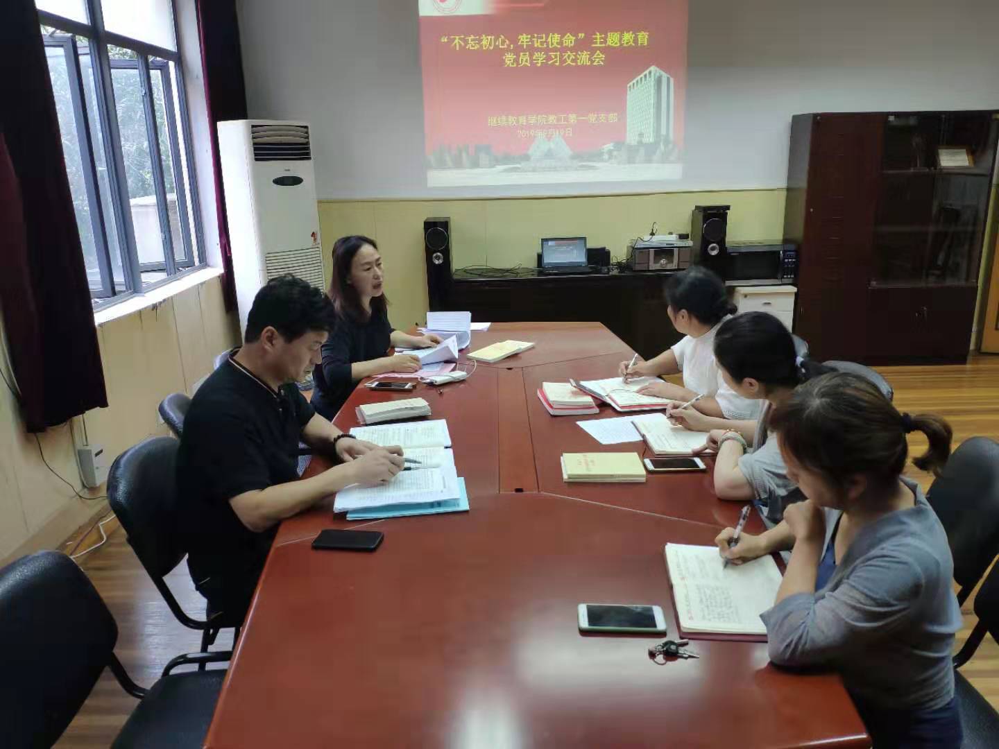 为深入学习贯彻“不忘初心、牢记使命”主题教育精神,全面落实继教产业联合党总支关于主题教育的部署安排,近日教工第一党支部在自学基础上,开展主题教育集中学习交流会。